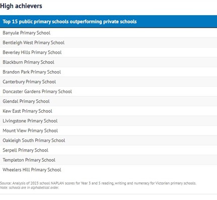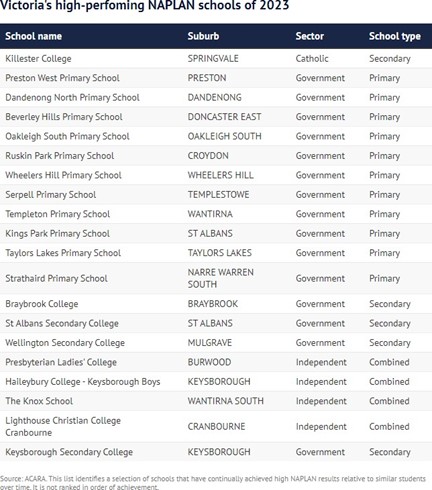 Victoria’s high-performing NAPLAN schools of 2023
