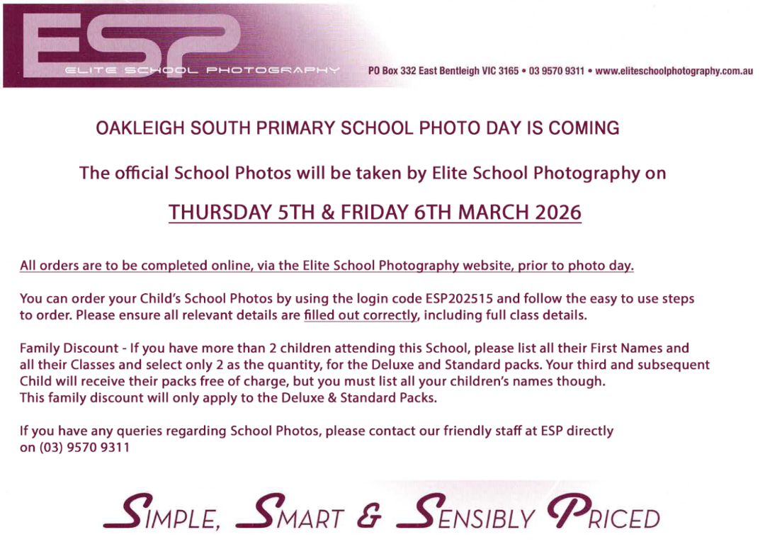 School Photo Day is fast approaching. Official school photos will be taken by Elite School Photography on Thursday 5 March and Friday 6 March 2026.