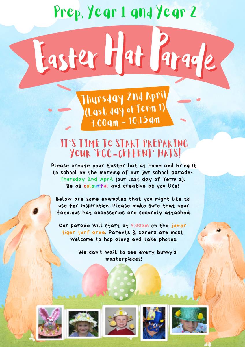 Our much loved Prep to Year 2 Easter Hat Parade will be celebrated on Thursday 2nd April (last day of Term 1).