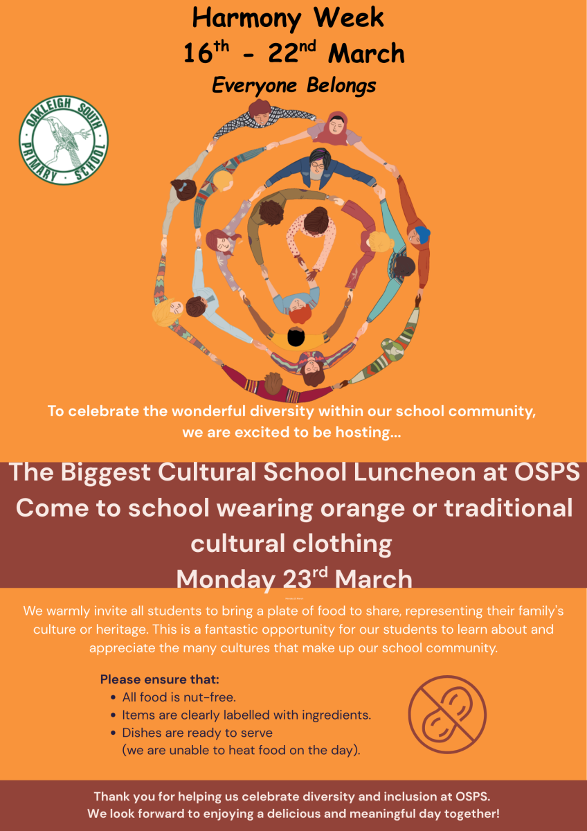 Harmony Week is the celebration that recognises our diversity and brings together Australians from all different backrounds. To celebrate the diverse cultures within our school community we will be hosting ‘The Biggest Cultural School Luncheon at OSPS on Monday 23 March.