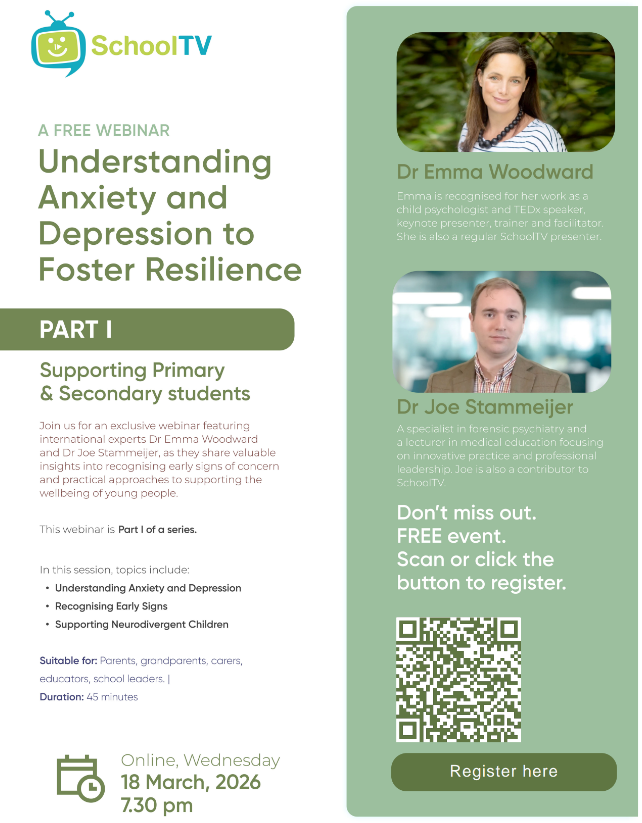 In recognition of our school’s commitment to student wellbeing through our partnership with SchoolTV, we are pleased to invite parents, carers, grandparents, school leaders and staff to attend an exclusive webinar, supporting both primary and secondary students.