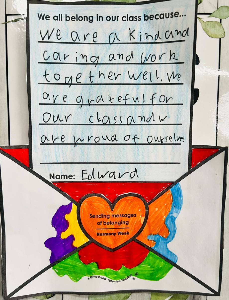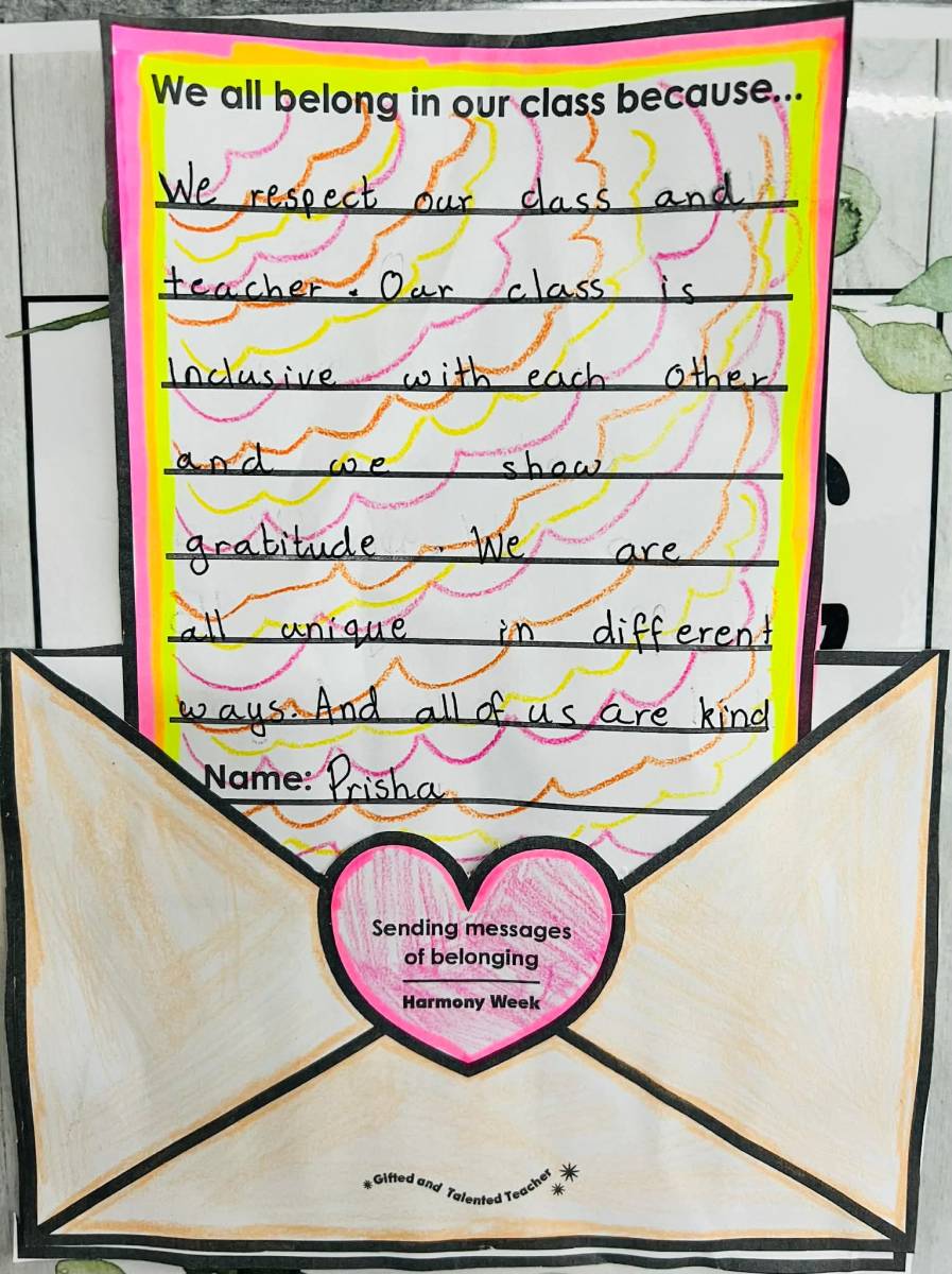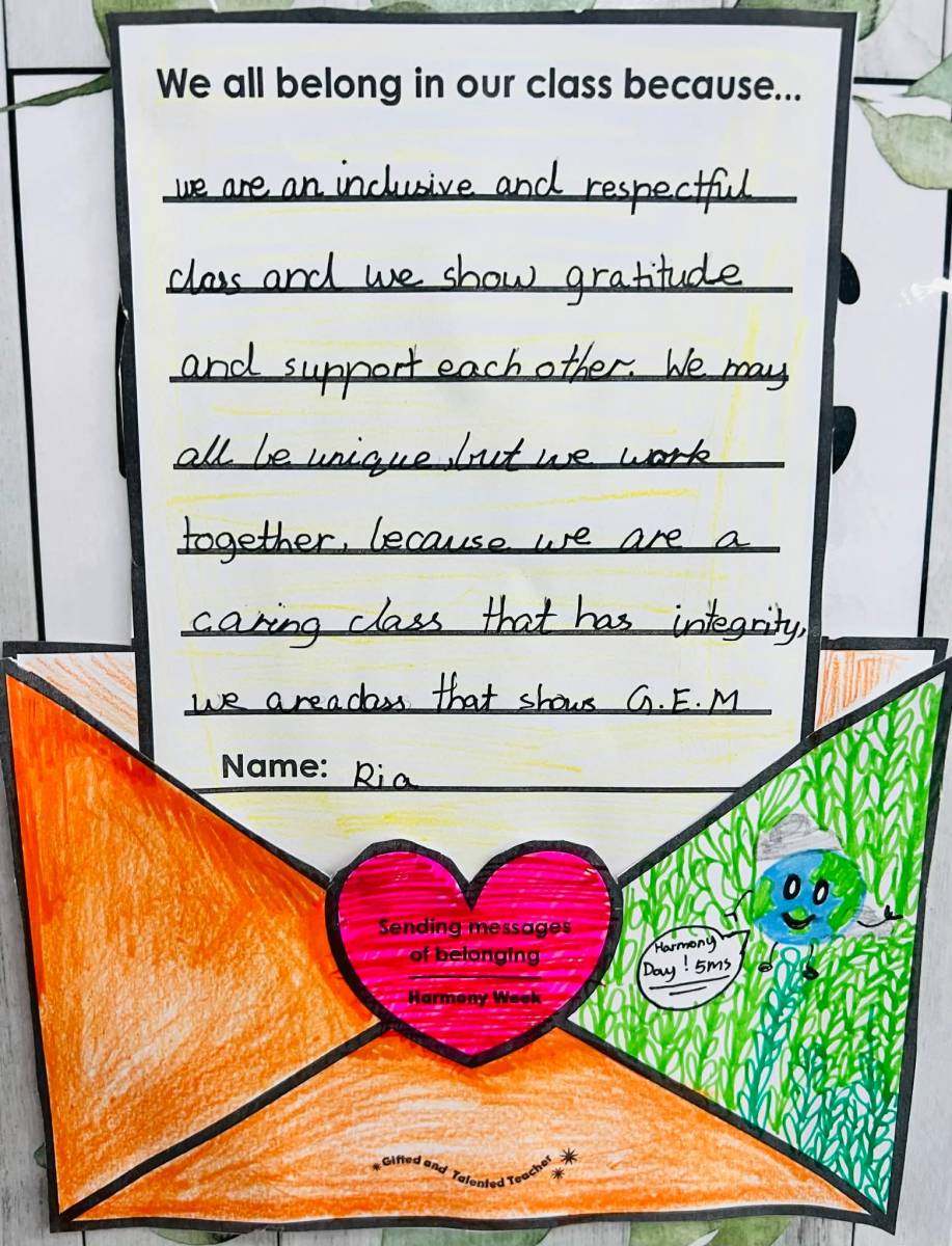For Harmony Day, students reflected on what makes their classroom a unique and harmonious place by writing thoughtful letters. They shared how kindness, respect, and inclusion help everyone feel valued and supported. Many students highlighted the diversity of cultures, ideas, and friendships within the class, and how these differences make their learning environment stronger and more vibrant. Through their writing, students celebrated the importance of working together and creating a space where everyone belongs.