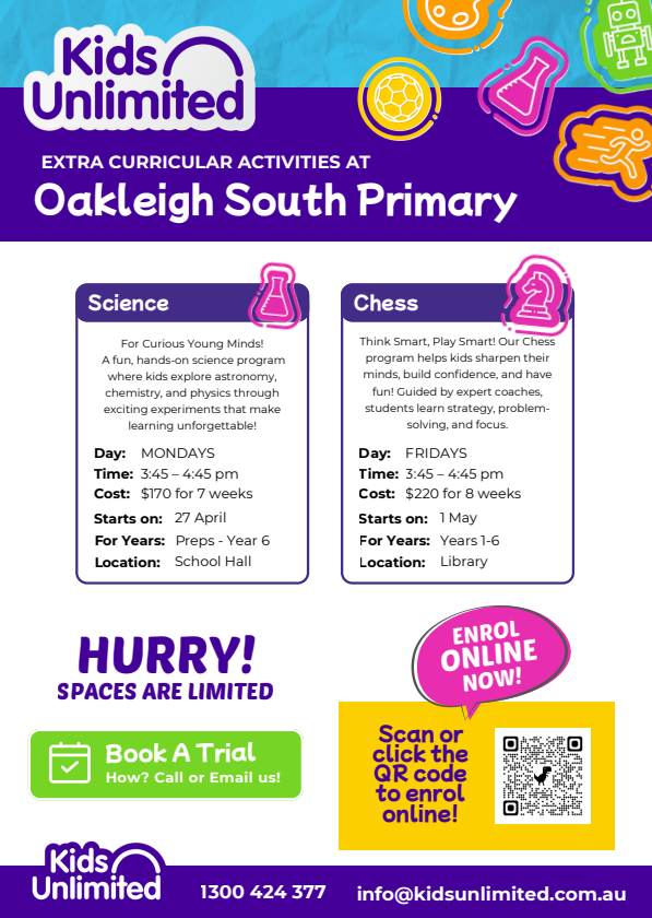 Disclaimer: The organisations advertised in this newsletter are not affiliated with and have no relationship to Oakleigh South Primary School. The publishing of these advertisements does not imply endorsement or recommendation of these products or services by the school. They are provided as a community service.