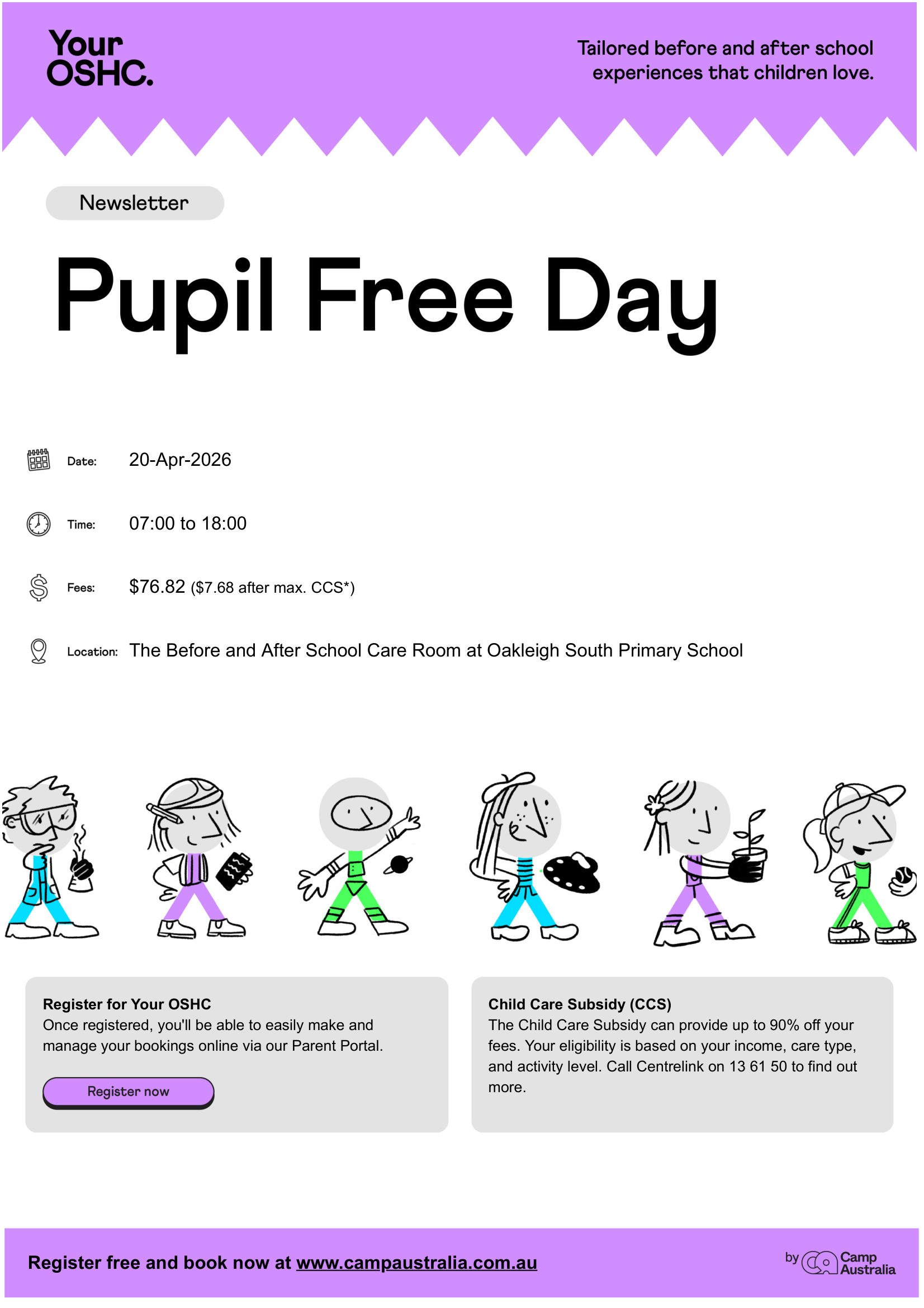 Camp Australia offers independent before- and after-school care (7:00 AM–8:45 AM and 3:30 PM–6:00 PM) in a safe, fun, and engaging environment. We recommend families register and book to ensure support in case of emergencies or last minute change-of-plans. More info and enrolment: campaustralia.com.au