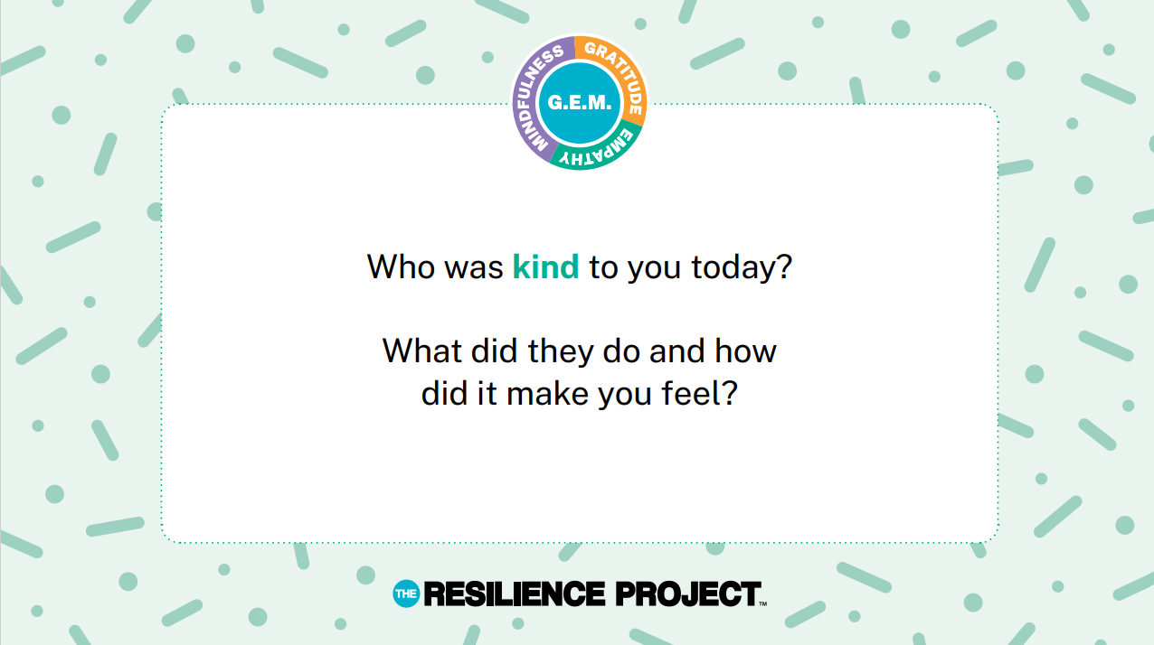 GEM Chats are daily conversation starters provided by TRP that encourage reflection on the GEM values: being grateful, empathetic, and mindful. We encourage parents to ask their child the prompt and engage in a discussion about these values. By making GEM Chats a part of your routine, you can help reinforce these positive habits and support your child’s ongoing wellbeing and emotional literacy.