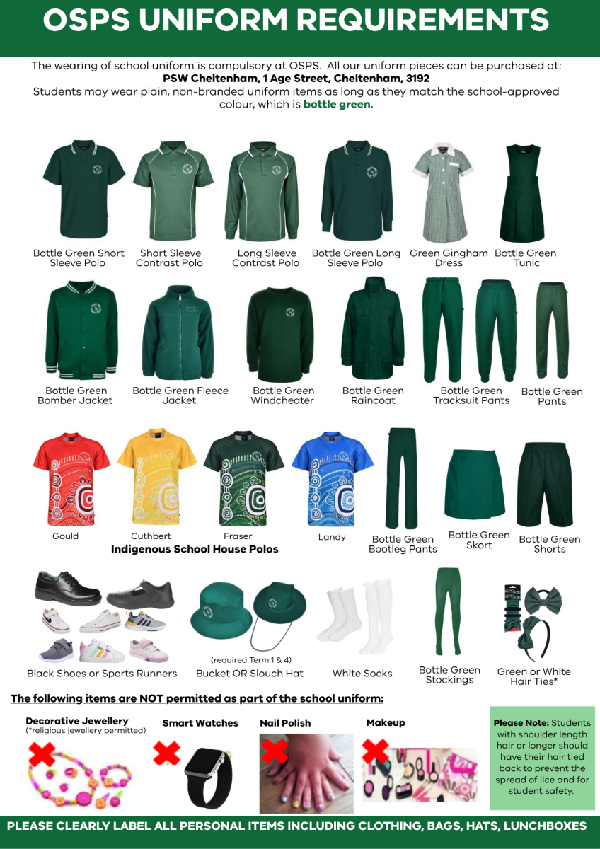 To stay warm, students may layer bottle green or white singlets or skivvies under their uniform and wear the OSPS jumper, bomber jacket or school beanie.