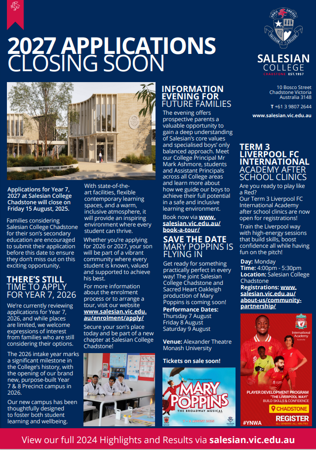Families received the Application for Year 7 Placement form early in Term 2, and all completed forms were due back by Friday 9 May 2025. Thank you to all families who submitted forms on time.