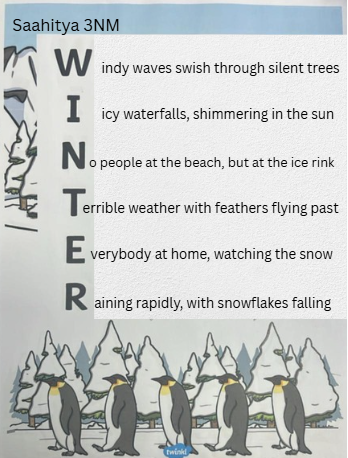 This term, our Year 3 students have been exploring the world of poetry. They are learning about different poetic forms, including acrostic poems, shape poems, and haikus.