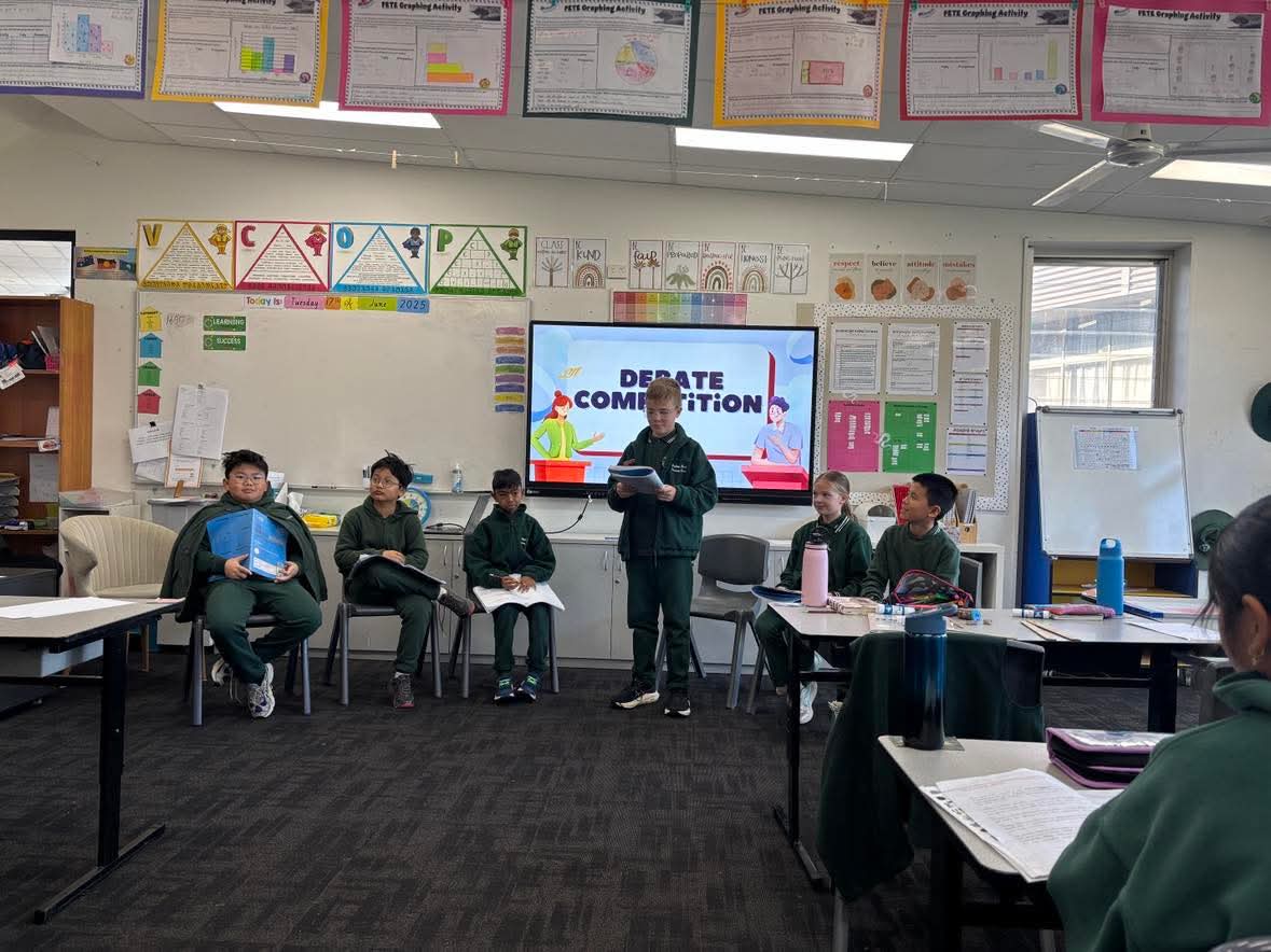 This term, Year 5 students have been building their speaking and listening skills through structured debates in their writing groups. They’ve learned the formal structure of a debate and practised brainstorming, researching, and presenting arguments as part of a team.