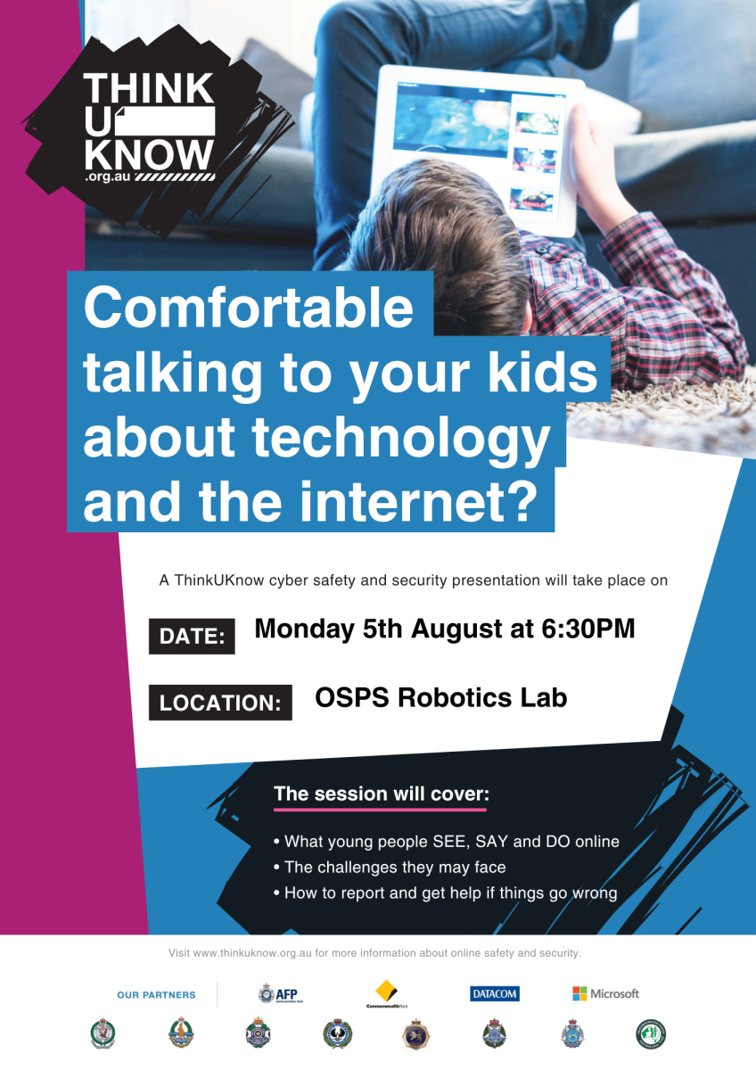 Oakleigh South Primary School is proud to host a ThinkUKnow presentation on Tuesday 5th August at 6:30pm in the Robotics Lab. All parents, carers and staff are warmly encouraged to attend.