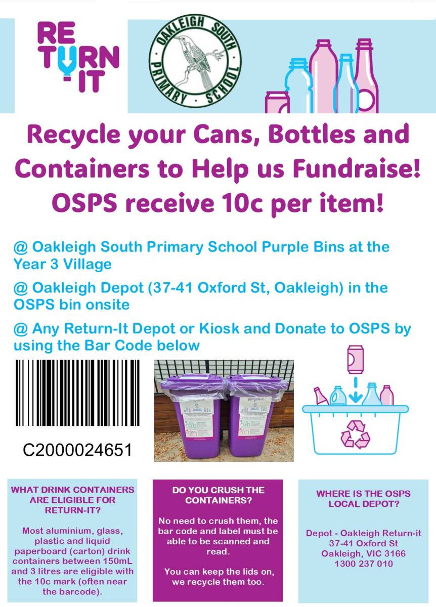 Please continue to support our sustainability efforts by placing eligible bottles and cans into the purple bins located in the Year 3 area.