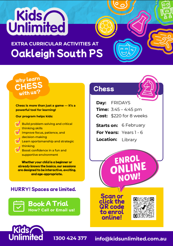 Disclaimer: The organisations advertised in this newsletter are not affiliated with and have no relationship to Oakleigh South Primary School. The publishing of these advertisements does not imply endorsement or recommendation of these products or services by the school. They are provided as a community service.