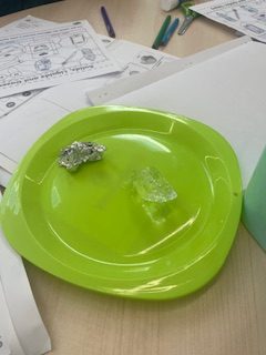 Students began by examining the properties of each state of matter—looking closely at how solids keep their shape, how liquids flow and change form, and how gases are all around us even though we can’t always see them. Using everyday objects such as ice, sand, water, balloons, and air-filled syringes, students sorted, tested, and predicted what state of matter each item represented.