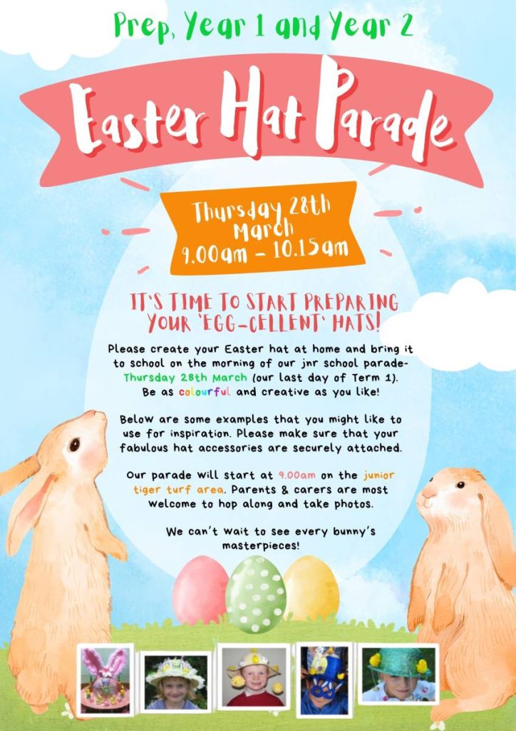Our beloved Prep – Year 2 Easter Hat Parade will be celebrated on Thursday 28th March. Please start designing and creating your hats at home – be as fun, creative or crazy as you like! Our parade will be held at 9.00am on the junior tiger turf area with each grade dancing around the ‘catwalk’, singing songs and capping off a fabulous Term 1 before we hop into the school holidays.