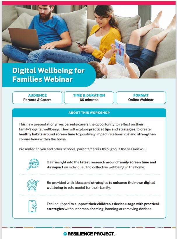 DIGITAL WELLBEING FOR FAMILIES – FREE WEBINAR FACILITATED BY THE RESILIENCE PROJECT