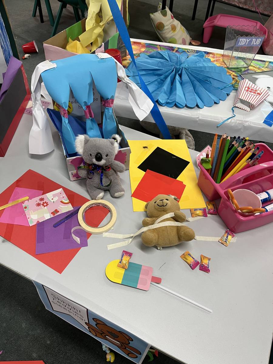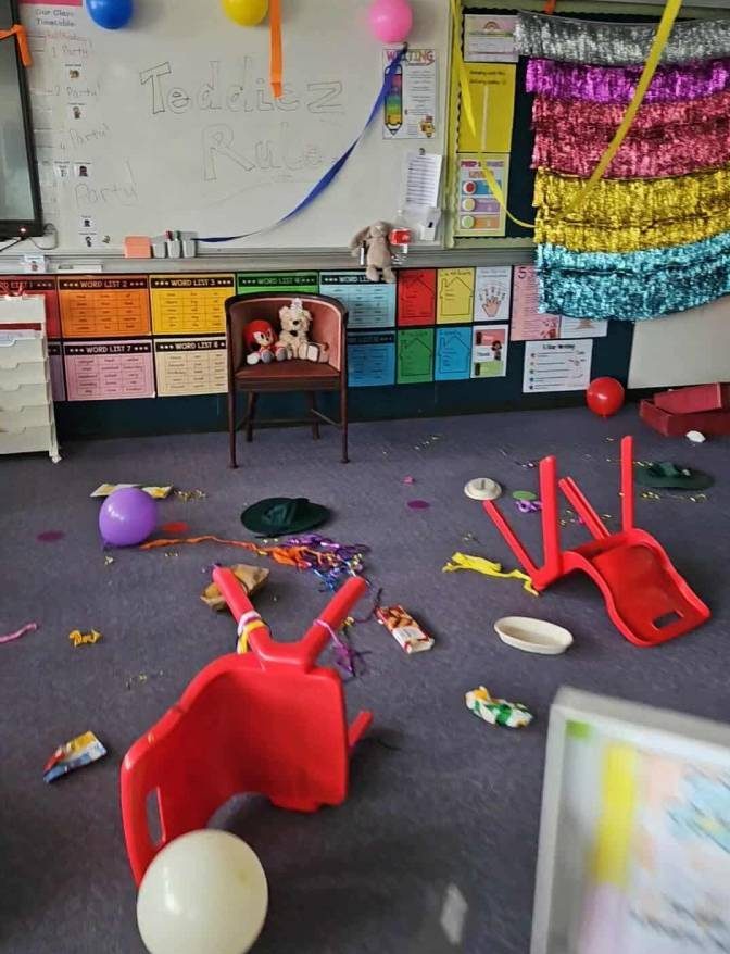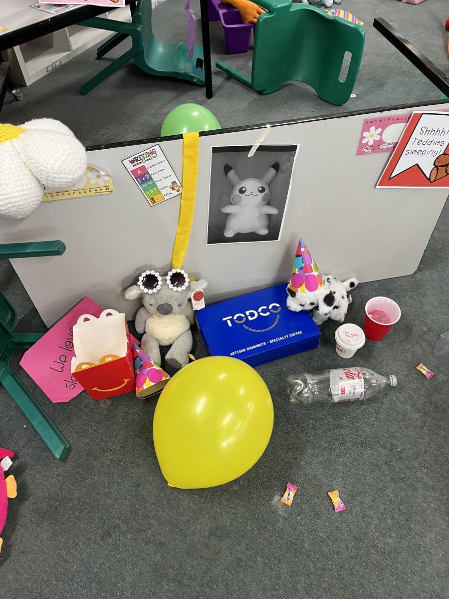 Instead, they had a huge PARTY! When the Preps arrived the next morning, they discovered the classrooms in complete chaos – chairs were toppled, pencils scattered, and teddies found in the most unexpected places! Some were caught eating McDonalds, others were hanging from fans, and some got artsy and did some painting!