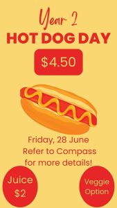 Parent Group will be hosting a hot dog lunch for the Year 2 classes on Friday, 28 June.
